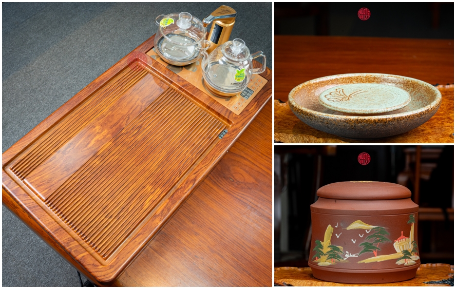 Để giữ cho bàn trà luôn sạch sẽ và thẩm mỹ, khay trà đạo đóng vai trò là nền tảng vững chắc phía dưới. Bên cạnh đó, các loại dụng cụ trà đạo như kẹp gắp trà, kim thông vòi và phễu lọc trà là những trợ thủ đắc lực giúp quá trình pha chế trở nên chuyên nghiệp hơn.